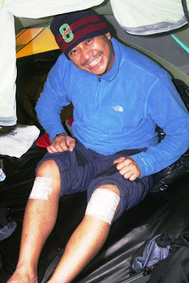 The author, after a river trekking (Penek Busay, Digos) accident last September 2007, sustaining bilateral 2 inches gaping cut on both his knees.Physical fitness and conditioning for mountaineering is a complex topic to discuss, often involving the ideas of a multi specialty training team but basically anchored on sound scientific, medical principles that is fine tuned by personal experiences. My fitness regimen was a product of reading, experiences of me and others I know, of trial and errors, of accidents and injuries I got whenever I hit the peaks or outdoors. I realized though that such experience and knowhow is of no use if not shared or taught to newbies willing to learn, and to experienced climbers avoiding accidents to happen while at their beloved sport.